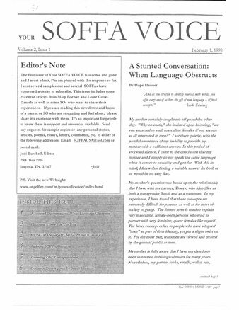 Collection: Your SOFFA Voice Institution: Louise Lawrence Transgender Archive Creator: Burchell, Jodi Date: Dec. 1, 1998 Topics: Acceptance, Allies, Coming out, FtMs, LGBTQ+ poetry, Parents of transgender people, Partners of transgender people, Support groups, Transgender community, Transitioning (Gender) Subject: American Boyz, Our Trans Children, Parents, Families and Friends of Lesbians and Gays (PFLAG), Sandra Cole, Southern Comfort Conference, Transgender Special Outreach Network (TSON), True Spirit Conference -