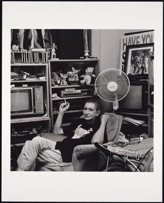 Photographs of Sylvia Rivera Sitting in a Red Shirt, Jean Skirt, and Black Tights with Her Legs Crossed