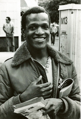 A Photograph of Marsha P. Johnson Wearing a Bomber Jacket and Holding Magazines