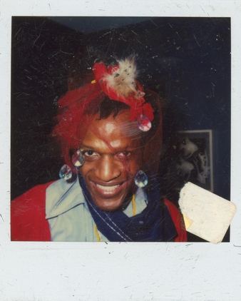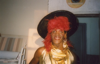 A Photograph of Marsha P. Johnson Wearing a Black, Red, and Gold Outfit