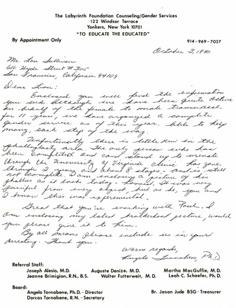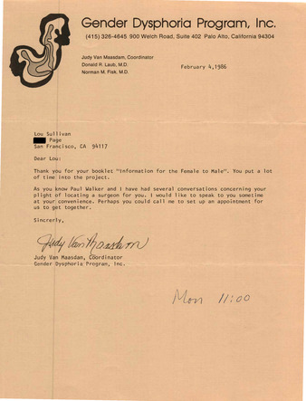 Collection: Lou Sullivan Collection Institution: GLBT Historical Society Creator: Sullivan, Lou, Tornabene, Angelo Date: Sep. 25, 1979 Topics: FtMs, Gender dysphoria, Hormone therapy, Plastic surgery, Psychiatry, Transitioning (Gender), Transsexual people Subject: Donald Laub, Stanford University Gender Dysphoria Program, The Labyrinth Foundation Counseling/Gender Service, Inc. -