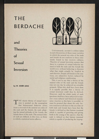 Collection: Newspaper and Periodical Clippings (1950-2000) Institution: ONE Archives at the USC Libraries Creator: Legg, W. Dorr Date: Spring 1959 Topics: Crossdressers, Crossdressing, Femininities, Gender role, Native americans, Polygamy, Sexuality, Two-Spirit people Subject: David Thompson, George Catlin, John Tanner, Male and Female, Margaret Mead, Peter Martyr, Pietro Martire D'Anghiera, Saulteurs Description: Content Warning: This item contains potentially sensitive material related to racist and transphobic language. -
