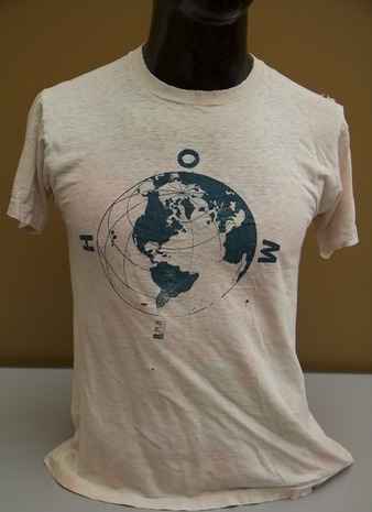 Collection: Clothing Collection Institution: Wearing Gay History Creator: Date: Unknown Topics: LGBTQ+ people of color, Lhamana, Native American LGBTQ+ people, Two-Spirit community, Two-Spirit people, Zuni Indians Subject: We'wha, WeWah and BarCheeAmpe Description: Off-white t-shirt. Printed on the front of the t-shirt in blue ink is a model of the globe with the word "HOME" surrounding it. Printed on the back of the t-shirt in lavender ink is a photograph of... -
