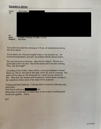 Collection: Marsha P. Johnson & Sylvia Rivera Institution: The Lesbian, Gay, Bisexual & Transgender Community Center Creator: Kohler, Bob Date: Feb. 19, 2002 Topics: Latino/a/x transgender people, Puerto Rican women, QTPOC, Trans women, Venezuelan Americans Subject: Randy Wicker, Stonewall Inn, Sylvia Rivera Description: An email informing Randy Wicker of Sylvia Rivera's death. -