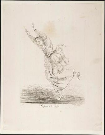 Collection: Art Works Institution: Yale University Libraries Creator: Sayers, James Date: Apr. 26, 1785 Topics: Crossdressing, Etching, Opera, Performing arts, Visual arts Description: "Delpini, dressed as a woman, both arms held above his head, runs forward in profile to the left imitating a dancer. Beneath the title is etched: "Grace was in all her Steps" &c."--British Muse... -
