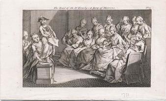 Collection: Art Works Institution: Yale University Libraries Creator: Date: 1771 Topics: Appearance, Clothing, Crossdressing, Etching, Jury, Social norms, Visual arts Subject: Chevalier D'Eon Description: "The Chevalier d'Eon (l.), wearing a military hat and the order of St. Louis round his neck, stands, partly draped, on a pedestal before a jury of twelve ladies (r.) who are to decide upon his sex,...