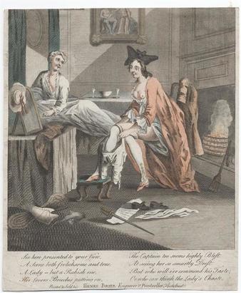 Collection: Art Works Institution: Yale University Libraries Creator: Date: Mar. 25, 1780 Topics: Animals, Appearance, Clothing, Couples, Crossdressing, Soldiers, Visual arts Description: Two people in a bedroom by a table set for tea. One is wearing a dress, along with a soldier's hat and a sword; conversely, the other is wearing soldier's vestments and has a women's wig and fan. -