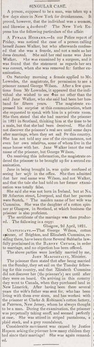 Collection: Newspaper and Periodical Clippings (Pre 1900) Institution: Digital Transgender Archive Creator: Date: Sep. 1, 1836 Topics: Arrests, Crossdressing, FtMs, LGBTQ+ partners, Marriage, Passing (Gender), Prisoners Subject: Eliza Cummings, George Moore Wilson, James Walker, Jane Walker Description: The North Carolina Standard (Raleigh, North Carolina) -