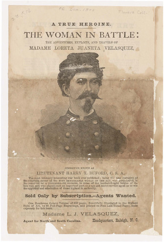 Collection: Newspaper and Periodical Clippings (Pre 1900) Institution: Duke University Creator: Date: circa 1876 Topics: Military, Soldiers, Soldiers--Confederate States of America--Biography, United States--History--Civil War, 1861-1865--Participation, Female Subject: Lieutenant Harry T. Buford, Loreta Juaneta Velasquez Description: Brochure advertising the publication of the book "The Woman in Battle" by Loreta Janeta Velazquez, who claims to have masqueraded as a male Confederate soldier during the Civil War. Includes highli...