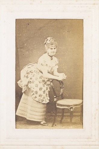 A man in drag resting against a chair. Photograph, 187-.