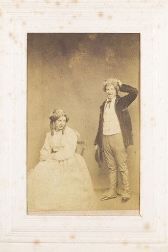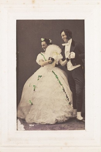 Two men, one in drag, posing as a performing couple. Photograph, 189-.