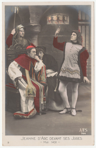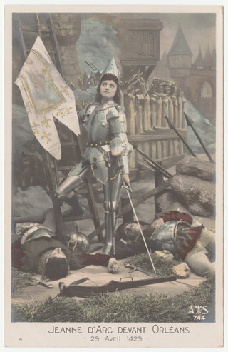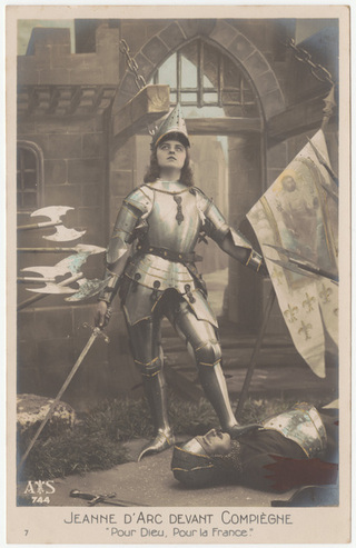 Collection: Postcards of Female and Male Impersonators and Cross-dressing Institution: Human Sexuality Collection, Cornell University Creator: Date: 1903 Topics: Male impersonators Description: Complete series of eight postcards portraying key moments in the history of Joan of Arc, with particularly high production values and tasteful, understated color tinting including judicious use of ... -