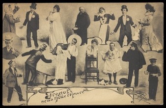 Collection: James Gardiner 20th Century Drag Postcards Institution: Wellcome Library Creator: Date: Jan. 1, 1903 Topics: Female impersonators Description: Leopoldo Fregoli wears different costumes within many inset portraits, including one dressed as a policeman with a moustache and cape. Leopoldo Fregoli (Italian, 1867-1936) was the greatest 'protea... -