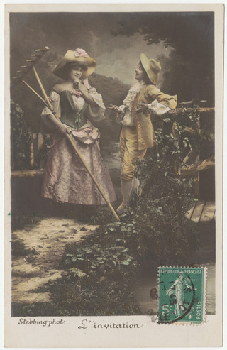 Collection: Postcards of Female and Male Impersonators and Cross-dressing Institution: Human Sexuality Collection, Cornell University Creator: Kunzli, Freres, Stebbing Date: 1903 Topics: Male impersonators Description: Inscription: "Series of love notes addressed to a woman named Albertine Frémoul from a man identifying himself as “votre fiancé” (signature partially illegible: “G. Rammeno...” Set of 5 cards with ... -
