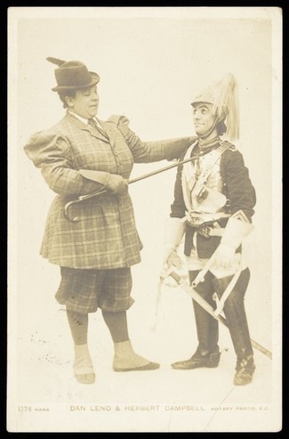 Herbert Campbell and Dan Leno in character. Photographic postcard by Hana Studios, 190-.