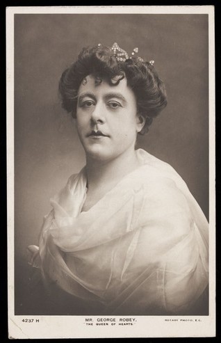 George Lashwood in drag performing a song about two lovers at twilight. Photographic postcard, 190-.