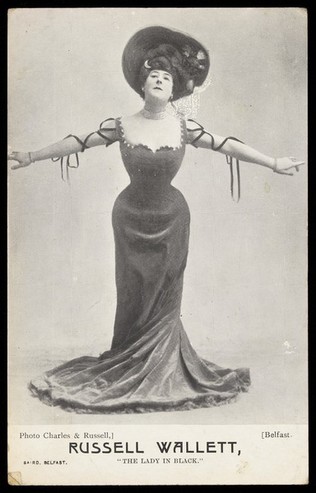 Russell Wallett in drag as a Gibson Girl. Process print, 19--.