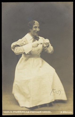 Tom E. Murray in character as "Mother Goose". Photographic postcard, 1907.