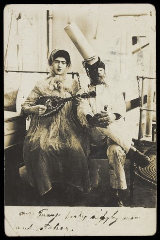 Two sailors (?) on board ship: one in drag is playing a guitar. Photographic postcard, 1907.