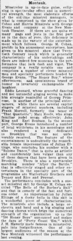 Collection: Newspaper and Periodical Clippings (1900-1949) Institution: Digital Transgender Archive Creator: Date: Jan. 5, 1909 Topics: Subject: 100 Honey Boys, Cohan and Harris Minstrels, Earl Benham, Eddie Leonard, Forty Count Em', Frank Morrell, George Evans, George M. Cohan, George Primrose, J.H Harverly, John King, Julian Eltinge, Matt Keefe, The Belle of the Barber's Ball, Watterbury Brothers and Tenney and Rice and Provost Description: Content Warning: This item depicts potentially sensitive content related to anti-Black racism. Clipping from The Brooklyn Daily Eagle talking about a minstrel show. -