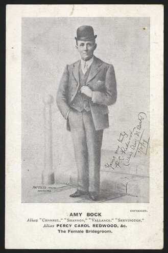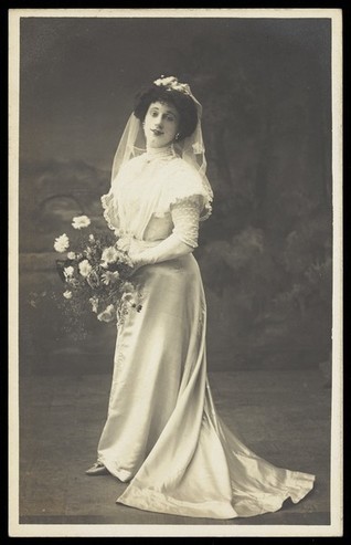 Arthur Grayson, dressed as a bride, for "The Jollity Boys". Photographic postcard, 1909.