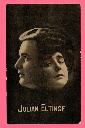 Collection: Ephemera Institution: JD Doyle Archives Creator: Date: 1910 Topics: Crossdressers, Crossdressing, Drag, Female impersonators Subject: Julian Eltinge Description: A postcard which reads "Julian Eltinge" beneath two juxtaposed images of Julian Eltinge's face, one masculine and one feminine. -