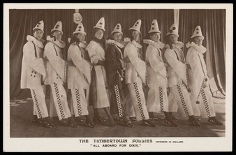 Actors gathered around a man in drag. Photographic postcard by The Fancy Dress Studio,...