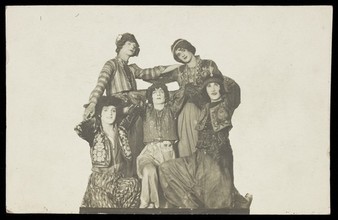 Sailors with men in drag outside a building. Photographic postcard, 191-.