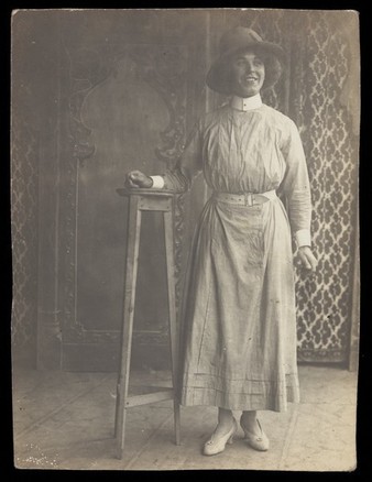 A prisoner of war dressed in drag. Photographic postcard by L. Soudan, 191-.