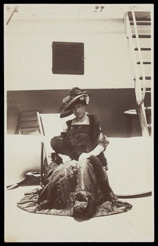 A sailor in drag sits on the deck of a ship in bright sunlight. Photographic postcard, 191-.
