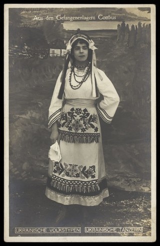 A Ukrainian prisoner of war performing a dance at a prisoner of war camp in Cottbus. Photographic postcard by P. Tharan, 191-.