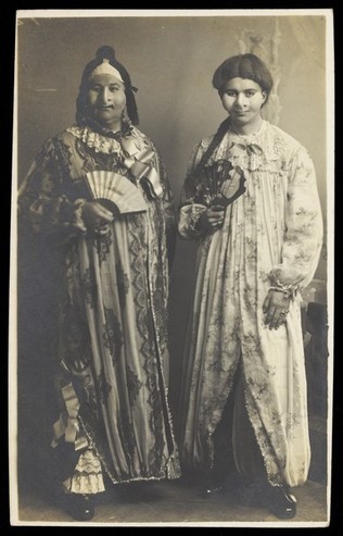 Two men in drag wearing face masks and patterned robes, holding fans. Photographic postcard, ca. 1910.