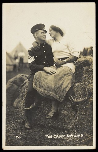 Two soldiers embracing on a bale of hay, one in drag. Photographic postcard, 191-.
