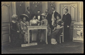 Actors performing French theatre at a prisoner of war camp in Cottbus. Photographic postcard, 191-.