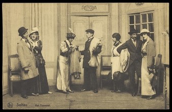 Actors, some in drag; with the attention focused on a character sitting at a table. Photographic postcard, 191-.