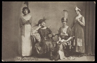 Amateur actors in drag, pose on stage as "The Blackthorns". Photographic postcard, 191-.