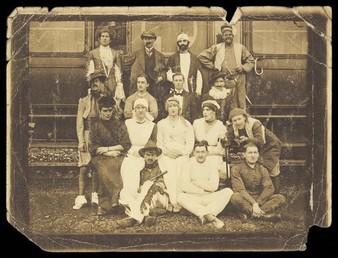 Actors sitting in front of an ambulance train, some in drag. Photograph, 191-.