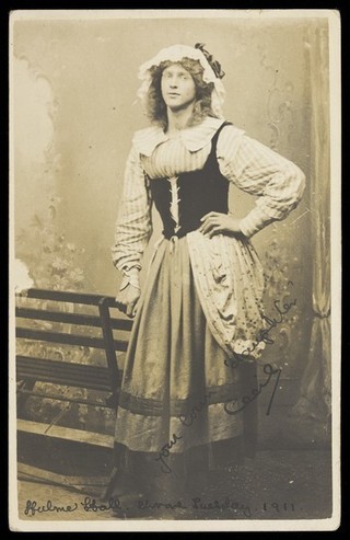 Malcolm Scott in character as an English queen. Photographic postcard, 191-.