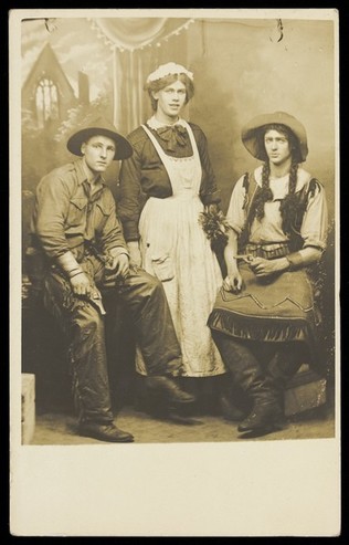 Three actors, two in drag, posing in cowboy costumes. Photographic postcard, 1911.