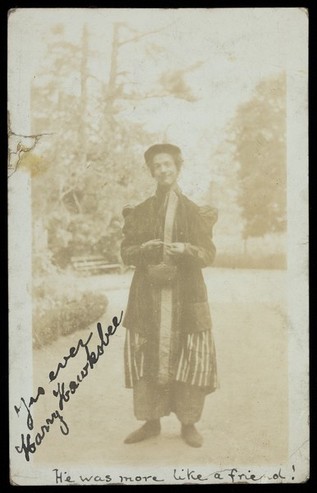 Harry Hawksbee in drag, wearing a large coat; posing outside near trees. Photographic postcard, 1914.
