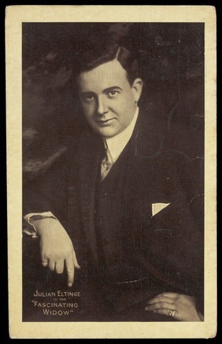 Collection: James Gardiner 20th Century Drag Postcards Institution: Wellcome Library Creator: Date: Jan. 1, 1914 Topics: Female impersonators Description: Julian Eltinge in male clothing. Julian Eltinge (born William Dalton, 1881?-1941), was perhaps the most successful American female impersonator of the twentieth century. By 1904 he was already appe... -