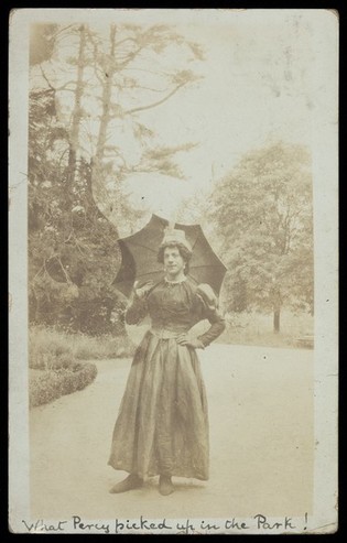 Collection: James Gardiner 20th Century Drag Postcards Institution: Wellcome Library Creator: Date: Jan. 1, 1914 Topics: Female impersonators Description: Harry Hawksbee, a music-hall entertainer, in drag, stands wearing a large dress and holding an umbrella. A private postcard from 1914, sent by Harry from Lees House at Yalding, Kent' to his friend ... -