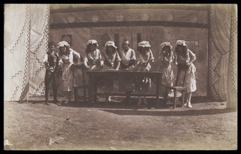British servicemen in drag acting out a cooking class. Photograph, 191-.