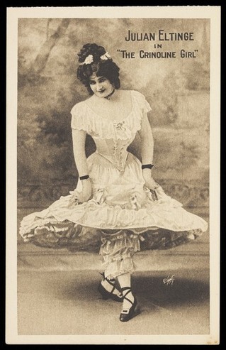 Julian Eltinge in drag wearing crinoline. Process print, ca. 1916.