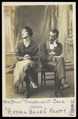 Collection: James Gardiner 20th Century Drag Postcards Institution: Wellcome Library Creator: Date: Jan. 1, 1917 Topics: Female impersonators Description: Both gaze out, turning their heads to the side. The man wears evening attire whereas Miss Timmins appears more casually dressed. A concert party behind the lines in France, March 1917. 'The Royal B... -
