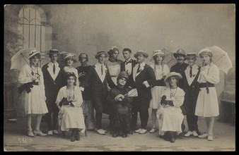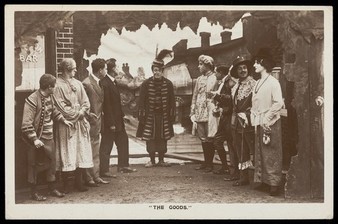 Sailors with men in drag outside a building. Photographic postcard, 191-.