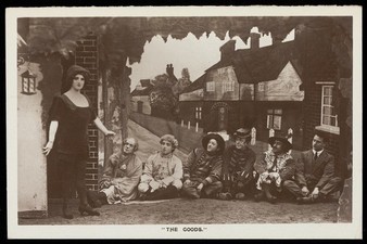 Seven men on stage set of "The seven acorns". Photographic postcard, 1918-1920.