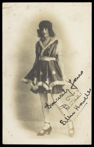 Billie Howell in drag, performing in a costume with a fur trim. Photograph, ca. 1918.