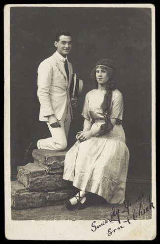 Ern and Chick, two actors, Chick in drag, pose in summer attire. Photographic postcard...