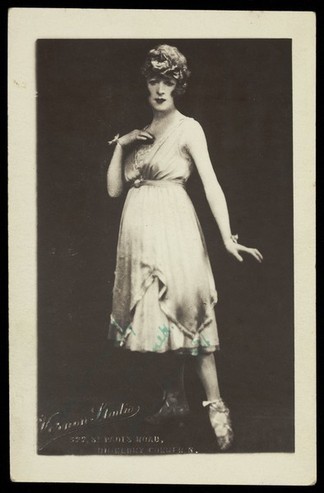 An actor in drag wearing a light dress and styled hair, poses in front of a black background. Photographic postcard by Vernon Studio, 1921.